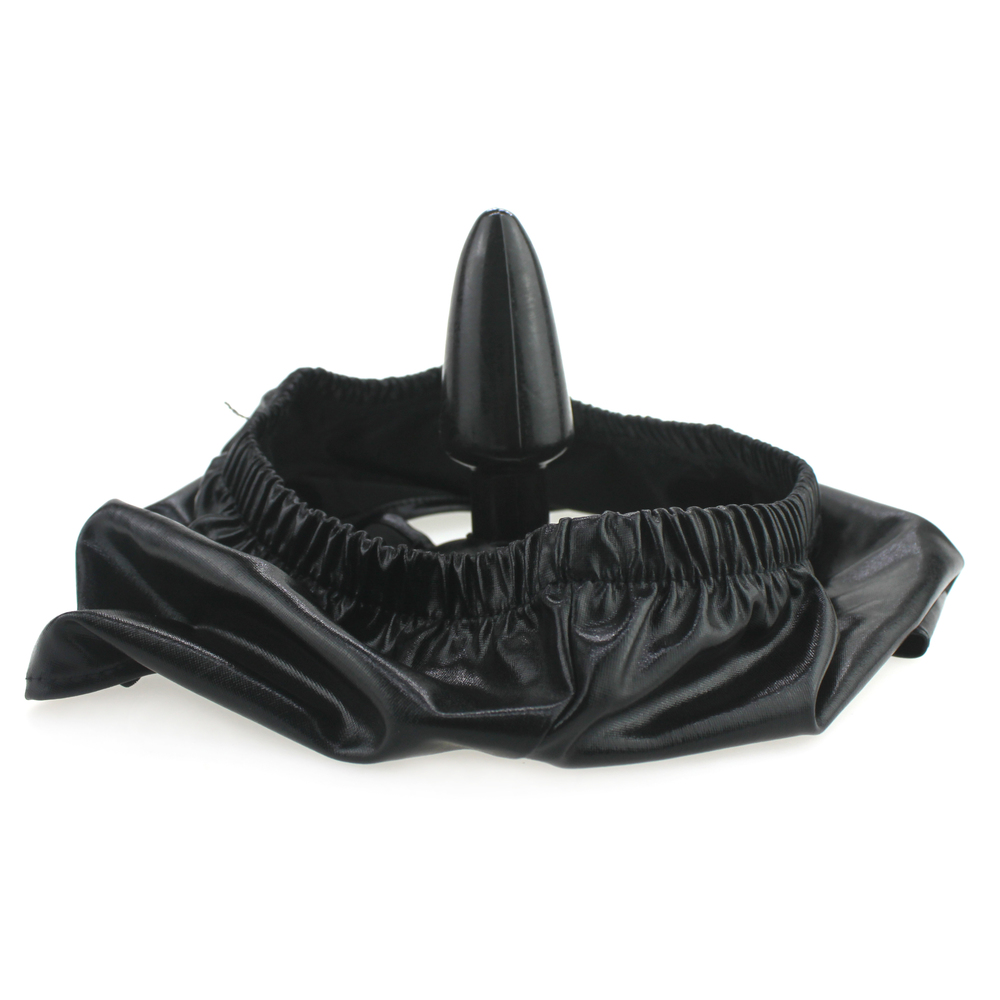 The solid anal plug is 9 cm long and 4 cm wide. The tight underpants made of imitation latex come in a matching black fetish look. The plug sits exactly where it should and ensures that you feel it with every movement!